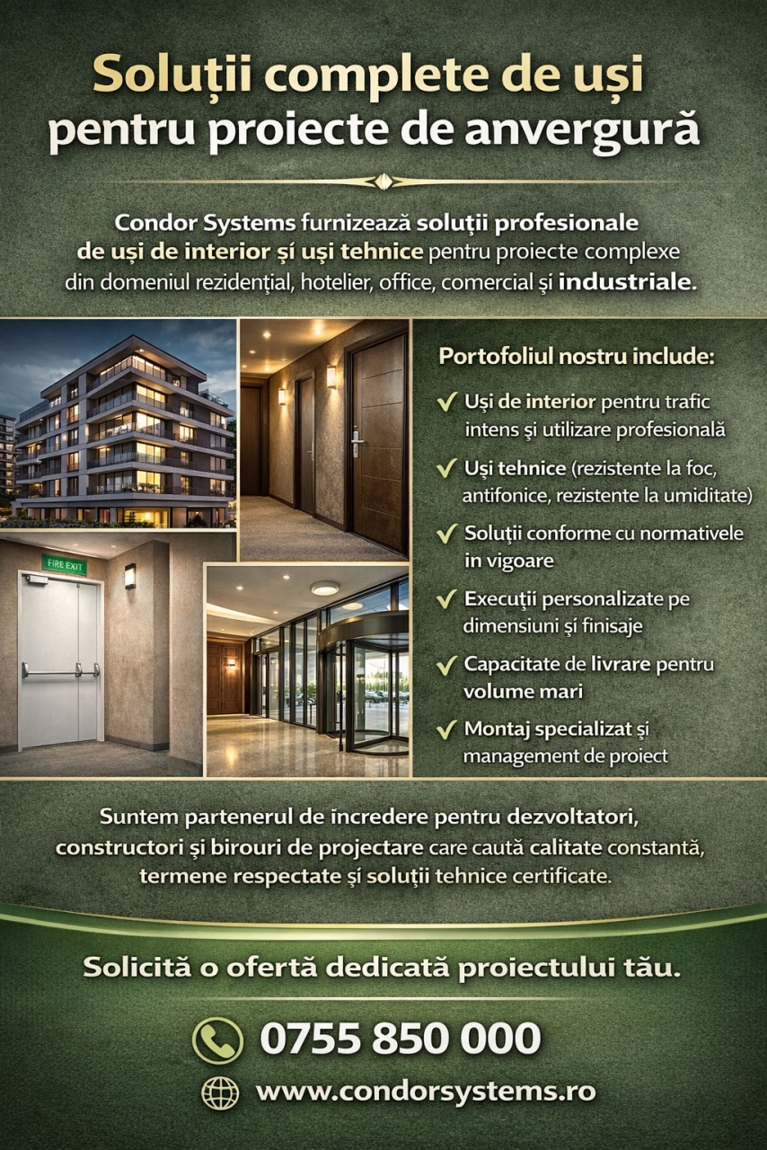 Condor Systems furnizează soluții profesionale de uși de interior și uși tehnice pentru proiecte complexe din domeniul rezidențial, hotelier, office, comercial și industrial. Oferim suport complet pe tot parcursul proiectului, de la consultanță tehnică și specificații, până la producție, livrare și montaj.